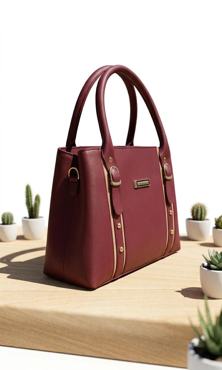 Make a bold statement with the Ethanfpurse Maroon & Cream Two-Tone Satchel. This bag features a sophisticated deep wine-red body accented by high-contrast cream-colored vertical straps. The design is elevated by polished gold-tone buckles, decorative studs, and a central logo plaque.
