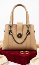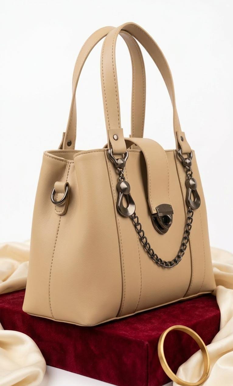 Product Description Master the art of understated power with a silhouette that embodies corporate-luxe precision. This satchel is rendered in a vibrant Sandstone beige, offering a clean, high-contrast canvas for its industrial-chic accents. The smooth, matte finish of the exterior is sharply interrupted by a draped gunmetal curb chain and bold, sculptural hardware, creating a sleek aesthetic that is both modern and authoritative.
