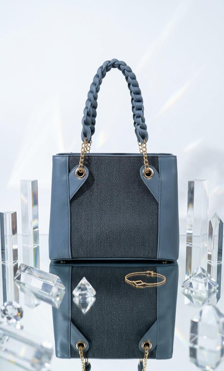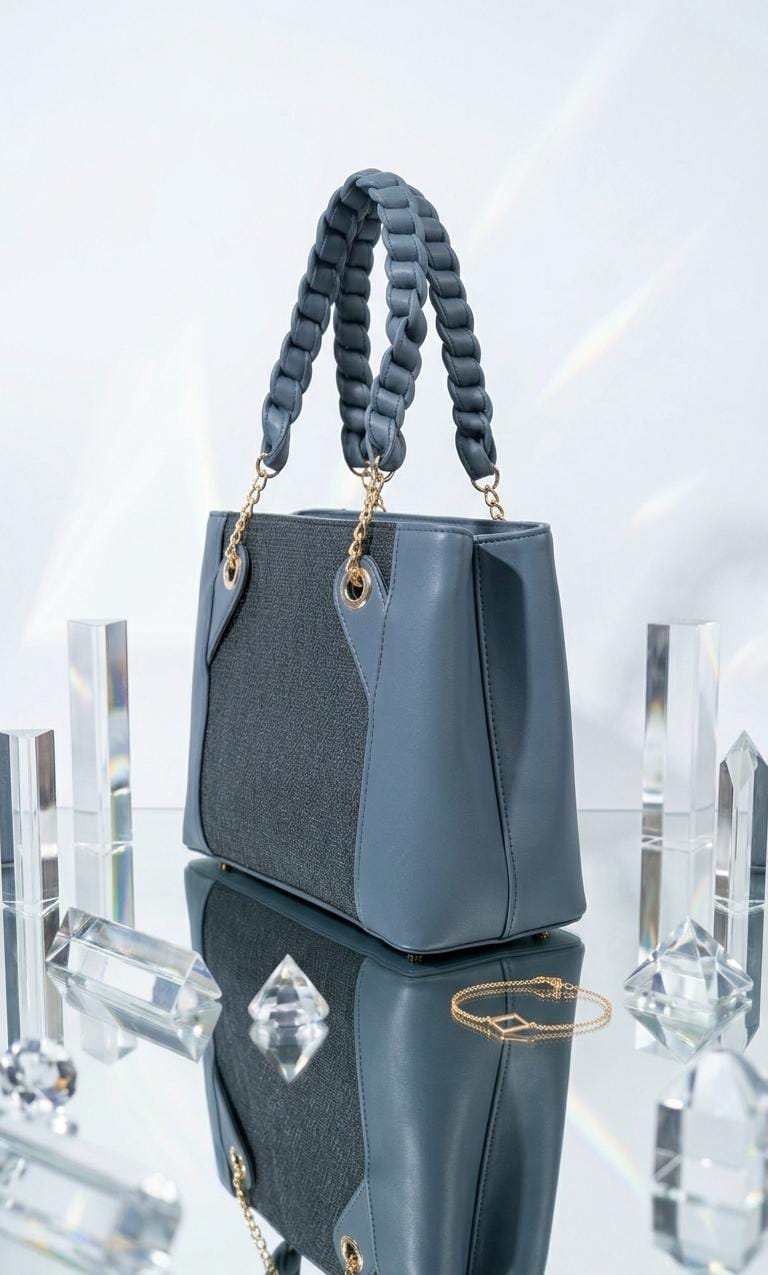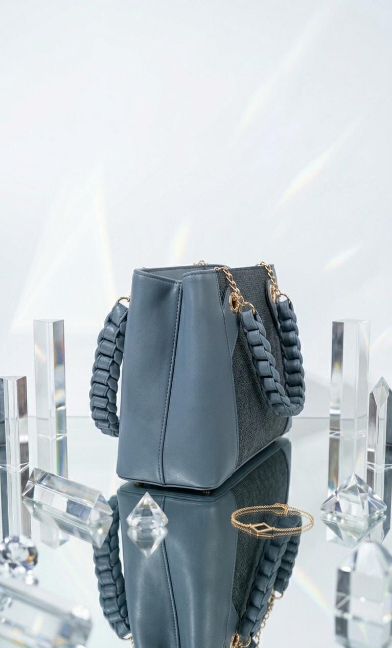 Project an image of cool, calculated confidence with a silhouette that masters the art of tonal contrast. This handbag is rendered in a vibrant Slate Azure blue, featuring a high-contrast mixed-media design that pairs smooth, architectural side panels with a textured, charcoal-woven center inlay. The centerpiece of this design is the oversized, ruched top handle, which provides a sculptural, high-fashion edge to a sleek corporate profile.